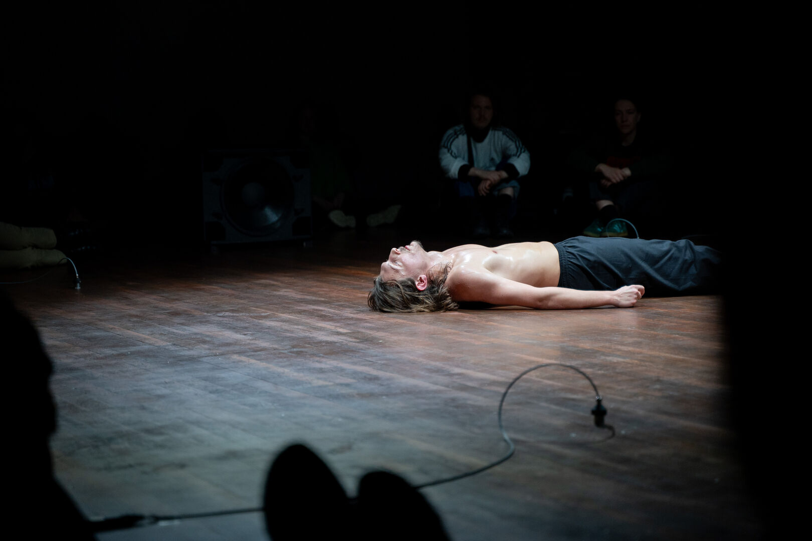 In één scène laat Biskas bijvoorbeeld zijn ledematen op de grond vallen. Door de zorgvuldig geplaatste speakers en de geluidsvormgeving van Boris de Klerk, vult de ruimte zich met de klanken en trilt helemaal. Langzaamaan hoor je de geluiden die Biskas’ lichaam maakt intensiveren. ‘Daardoor lijkt het alsof alle botten in dat lichaam over elkaar heen gaan,’ licht Van Gog toe. ‘Alsof je ze bijna hoort breken. Op een bepaalde manier word je zo op je eigen materialiteit teruggeworpen.’